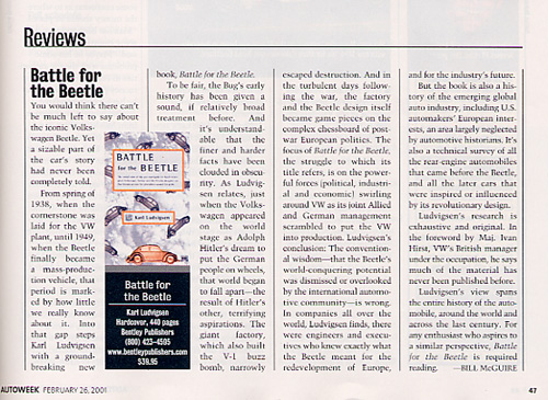 Ludvigsen's view spans the entire history of the automobile, around the world and across the last century. For any enthusiast who aspires to a similar perspective, Battle for the Beetle is required reading.
